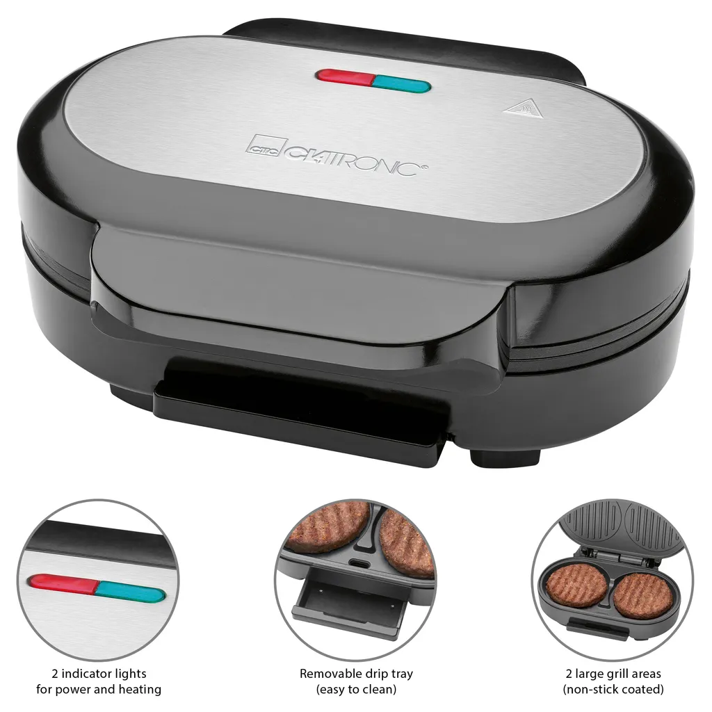 Clatronic HBM 3696 Hamburger-Grill, 2 Große Grillflächen, 2 Kontrollleuchten, Herausnehmbarer Fettauffangbehälter, 1.000 Watt