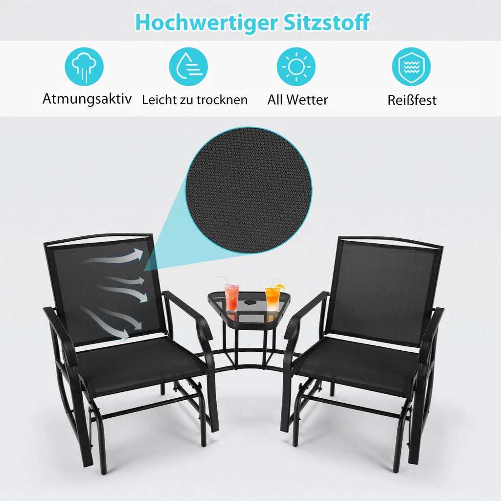 COSTWAY 2-Sitzer Gartenmöbel Set Mit Tisch & Schirmloch, Balkonmöbel Mit Atmungsaktivem Stoff, Sanftes Schaukelfunktion, Gartenbank Sitzgarnitur Für Garten, Terrasse, Balkon (Schwarz)
