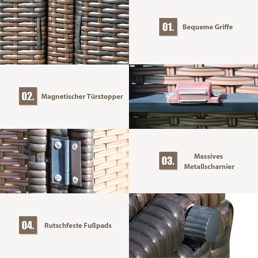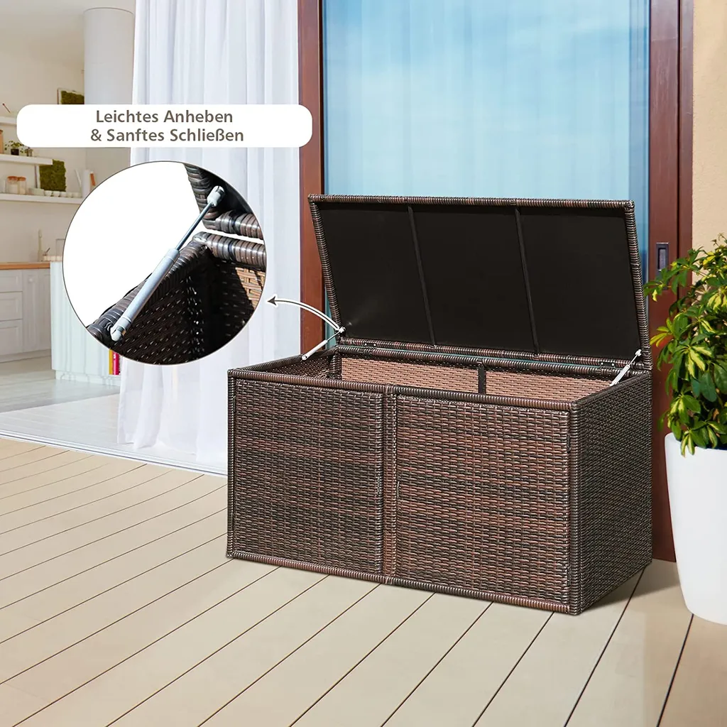 COSTWAY Auflagenbox Rattan 335L Stauraum, Kissenbox Mit Doppeltüren & Ablage, Truhenbank Sitzbank Für Terrasse Garten Balkon 115x60x65cm (Braun)