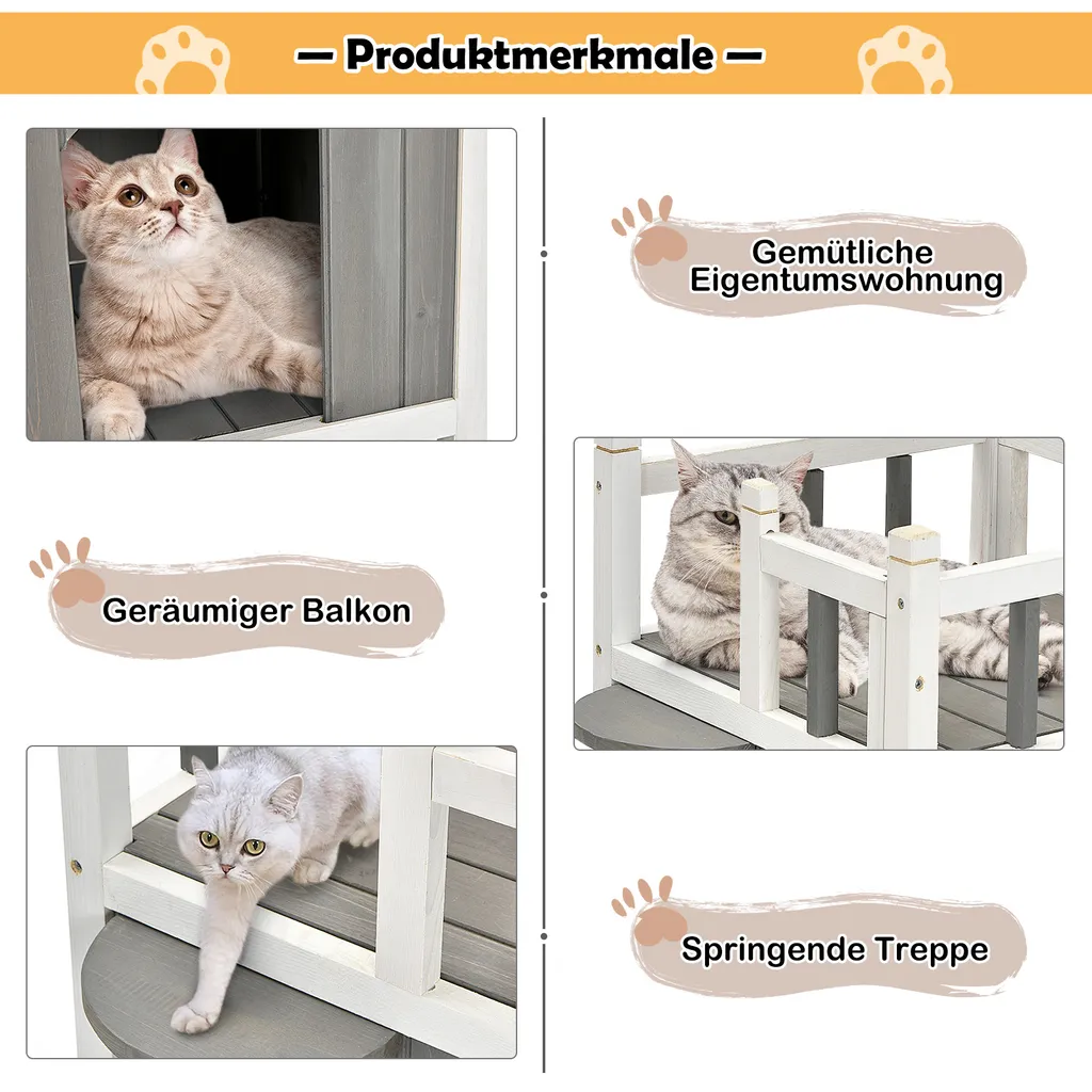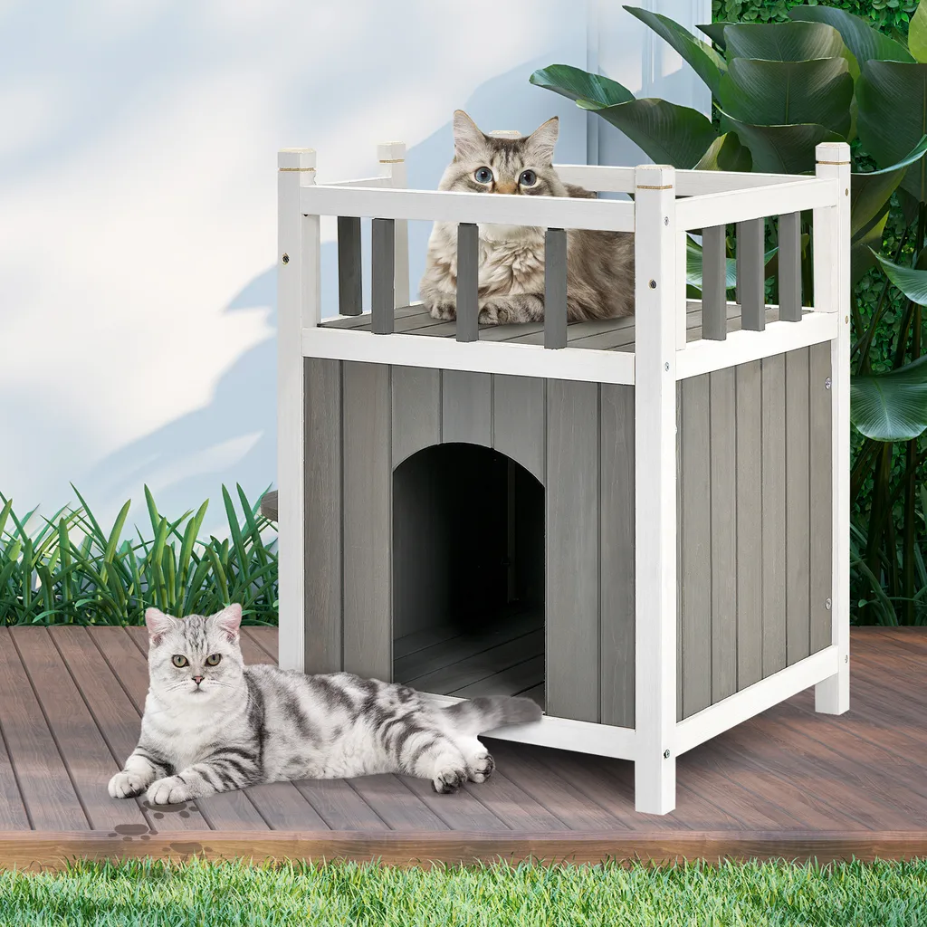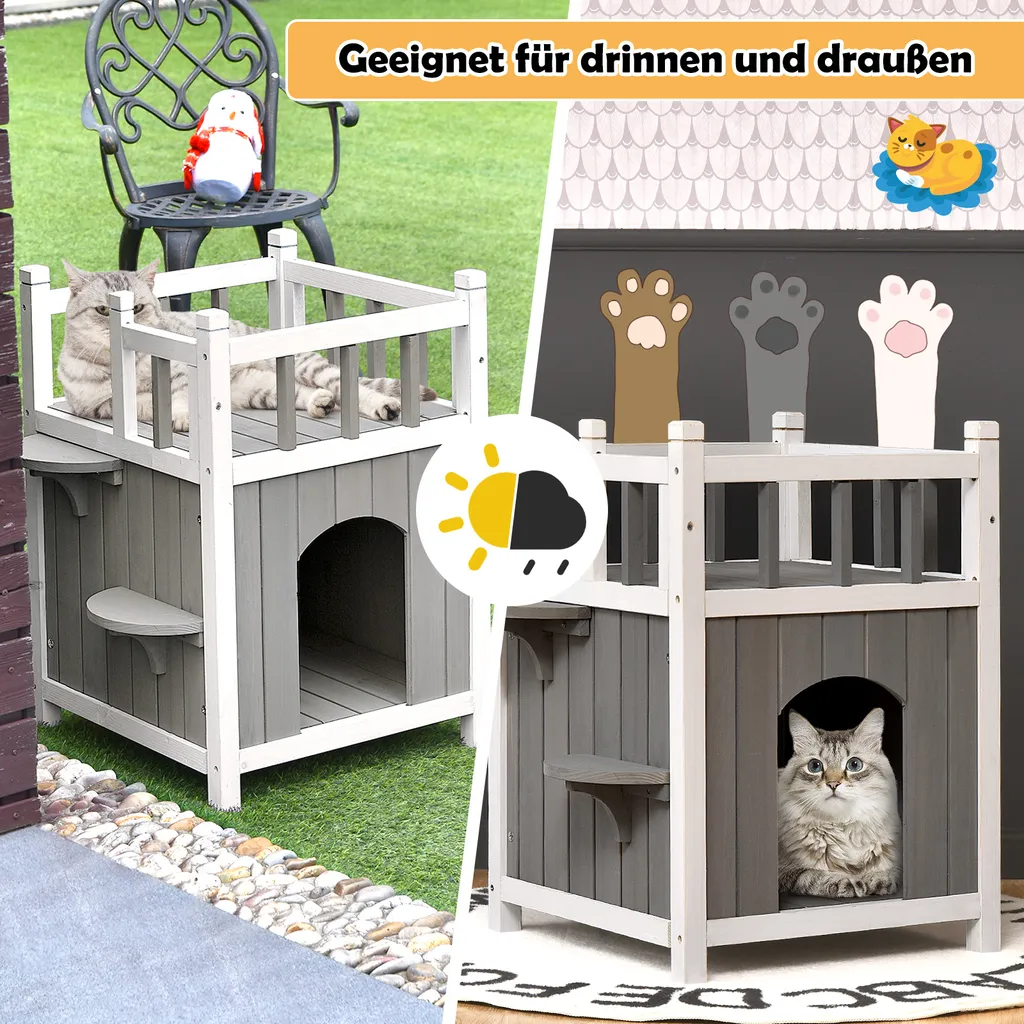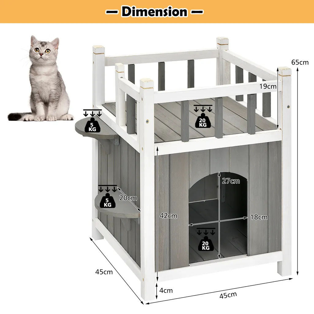 COSTWAY Hölzernes Katzenhaus Outdoor Winterfest, Katzenhütte 2 Ebenen, Holz Katzenhöhle, Haustierhütte Wetterfest Für Draußen Und Drinnen 45x45x65cm