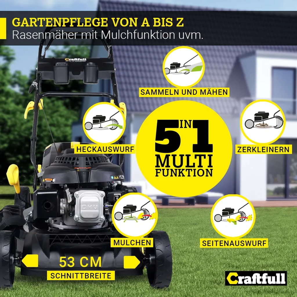Craftfull Benzinrasenmäher CR-196-10E, 53 Cm Schnittbreite, Benzin Rasenmäher Mit Radantrieb Inkl. Elektrostarter & Rasenkamm, 196 Cc, 4,4 KW / 6PS, Euro 5 Norm, 5in1, Marken Motor, GT-Markengetriebe, 8 Stufen Höhenverstellbar, 62 Liter Fangsack, Easy-Clean-Funktion