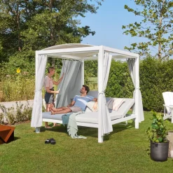 HOME DELUXE Sonnenliege LYON – Mit Abdeckung – 208 X 188 X 207 Cm – 3-fach Verstellbare Rückenlehne, Inkl. Auflagen & Vorhänge |Gartenliege Mit Sonnendach, Doppelliege, Doppel-Sonnenbett