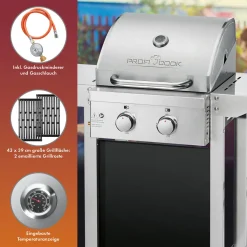 ProfiCook Gasgrill, Mit Klappbaren Seitentischen, 2 Edelstahlbrenner, Stufenlose Temperatursteuerung, Inkl. Temperaturanzeige, Balkon-Grill, Grillfläche: 43 X 39 Cm, PC-GG 1255