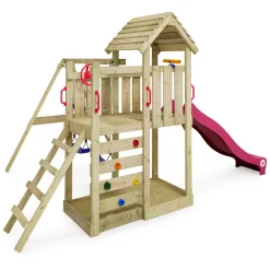 WICKEY Spielturm Klettergerüst MultiFlyer Holzdach Mit Schaukel & Rutsche, Kletterturm Mit Holzdach, Sandkasten, Leiter & Spiel-Zubehör – Violett