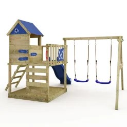 WICKEY Spielturm Klettergerüst SeaFlyer Mit Schaukel & Rutsche, Baumhaus Mit Sandkasten, Kletterleiter & Spiel-Zubehör – Blau