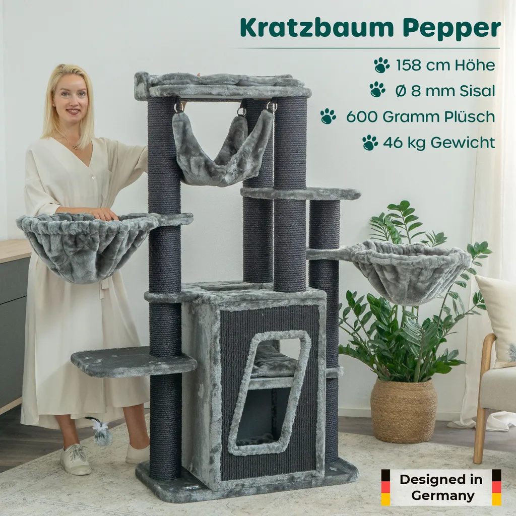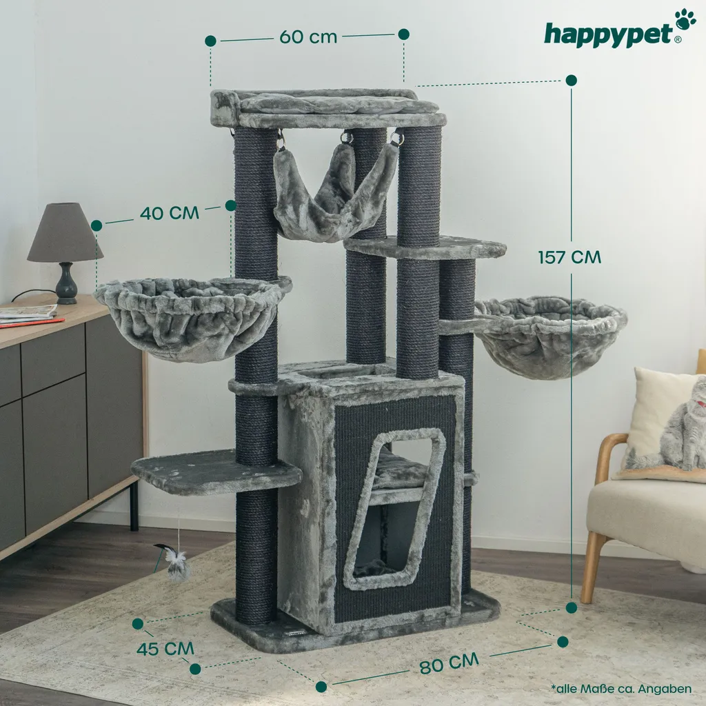 HAPPYPET Kratzbaum Stabil Pepper 157 Cm Hoch | Premium Katzenkratzbaum Für Große Katzen | Mit 2 Liegemulden, Hängematte, Doppelstöckige Höhle | 12 Cm Sisalstämme | Inkl. Spielball & Zubehör