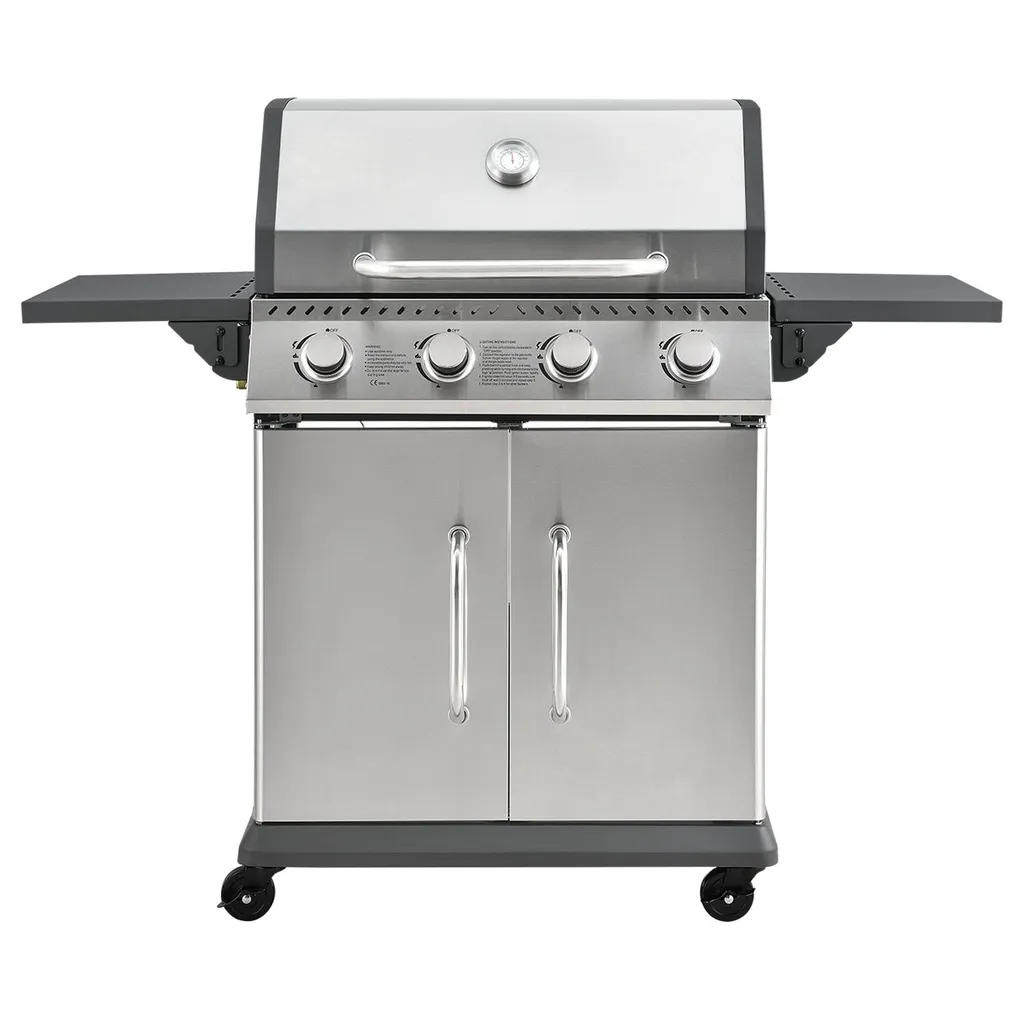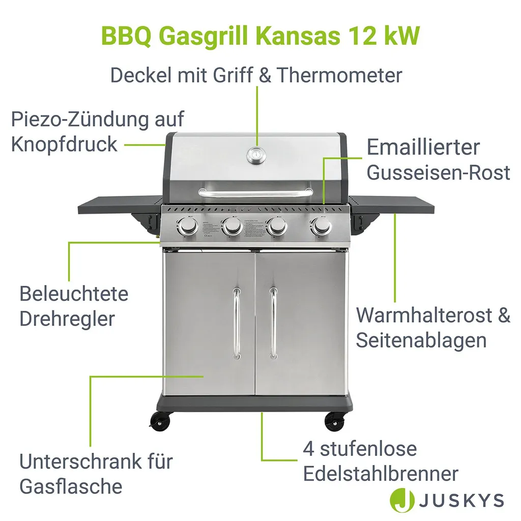 Juskys Gasgrill Kansas Mit 4 Brenner 12 KW, BBQ Grill Mit Gusseisen-Grillrost, Warmhalterost & Thermometer, XL Grillwagen 2 Seitenablagen & 4 Räder