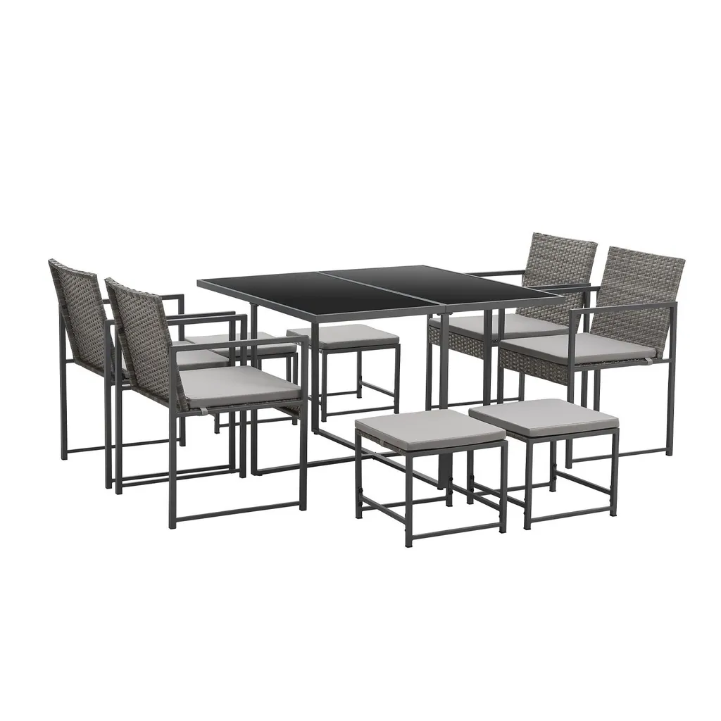 Juskys Polyrattan Sitzgruppe Bahamas L – Tisch, 4 Stühle, 4 Hocker & Kissen – Inkl. Plane – Essgruppe Für 8 Personen – Industrial Gartenmöbel Set Grau