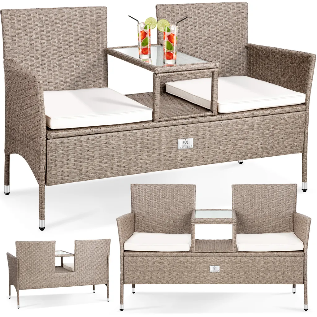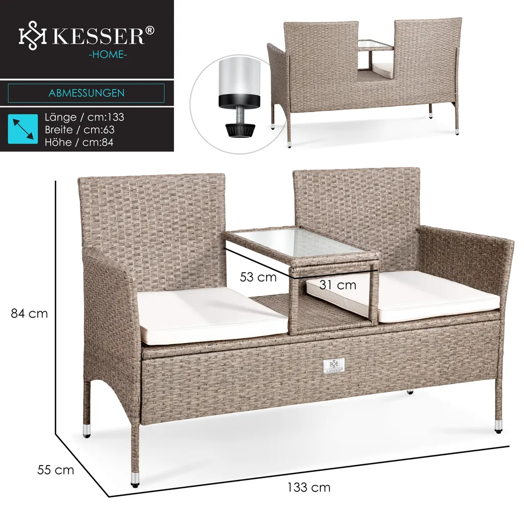 KESSER® Polyrattan Gartenbank 2-Sitzer Bank Mit Integriertem Inkl. Tisch & Kissen – 133 × 63 × 84 Cm – Rattan Sitzbank Garten Balkon Gartensofa Wetterfest Sitzgruppe Ultra Stabile, Farbe:Grau