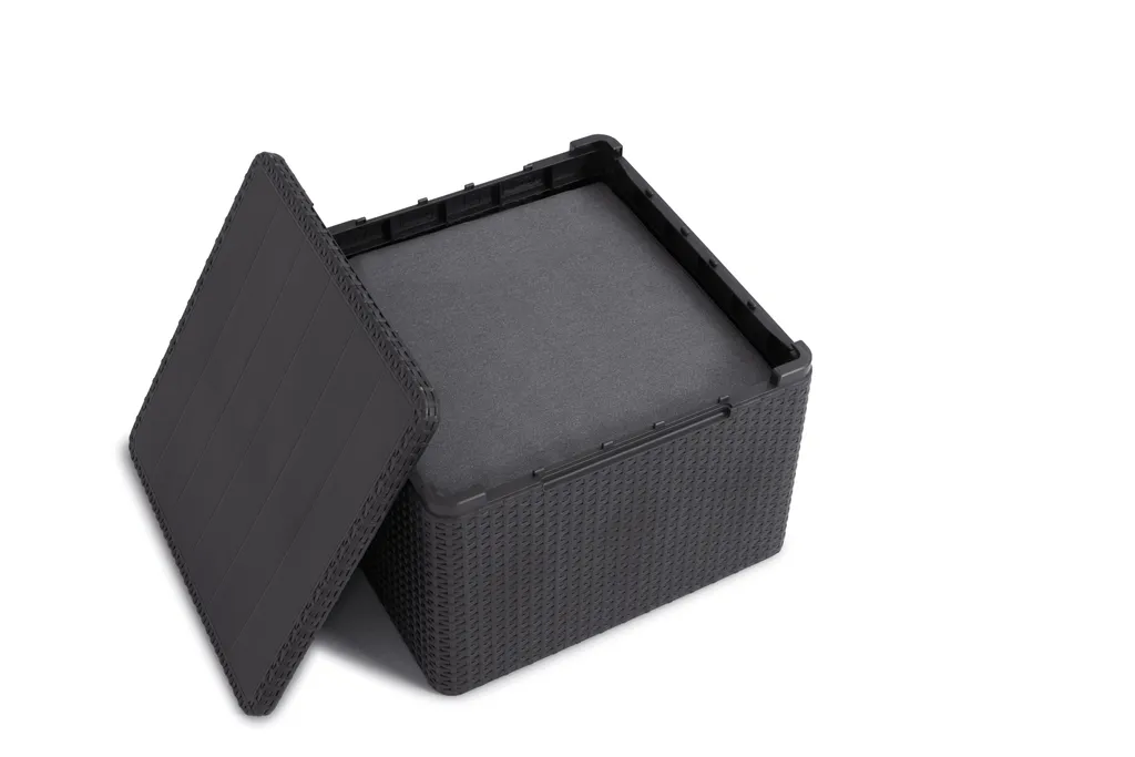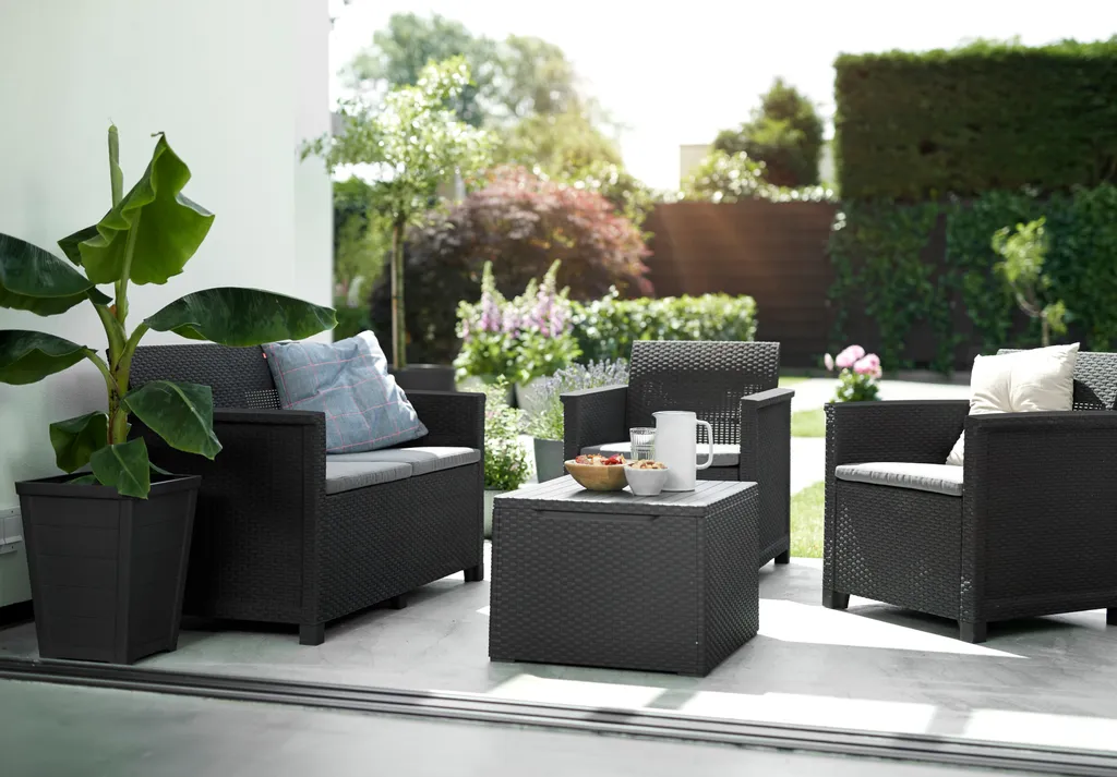 Keter Lounge Set Emma 8-teilig – Graphit , 2 Sessel + 2er Sofa + 1 Tisch Mit Aufbewahrungsbox-Funktion + 4 Sitzauflagen
