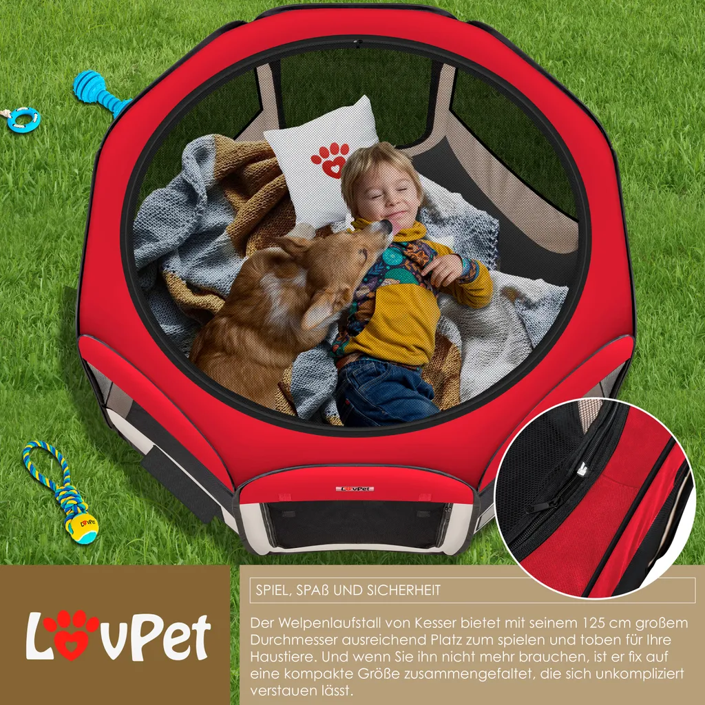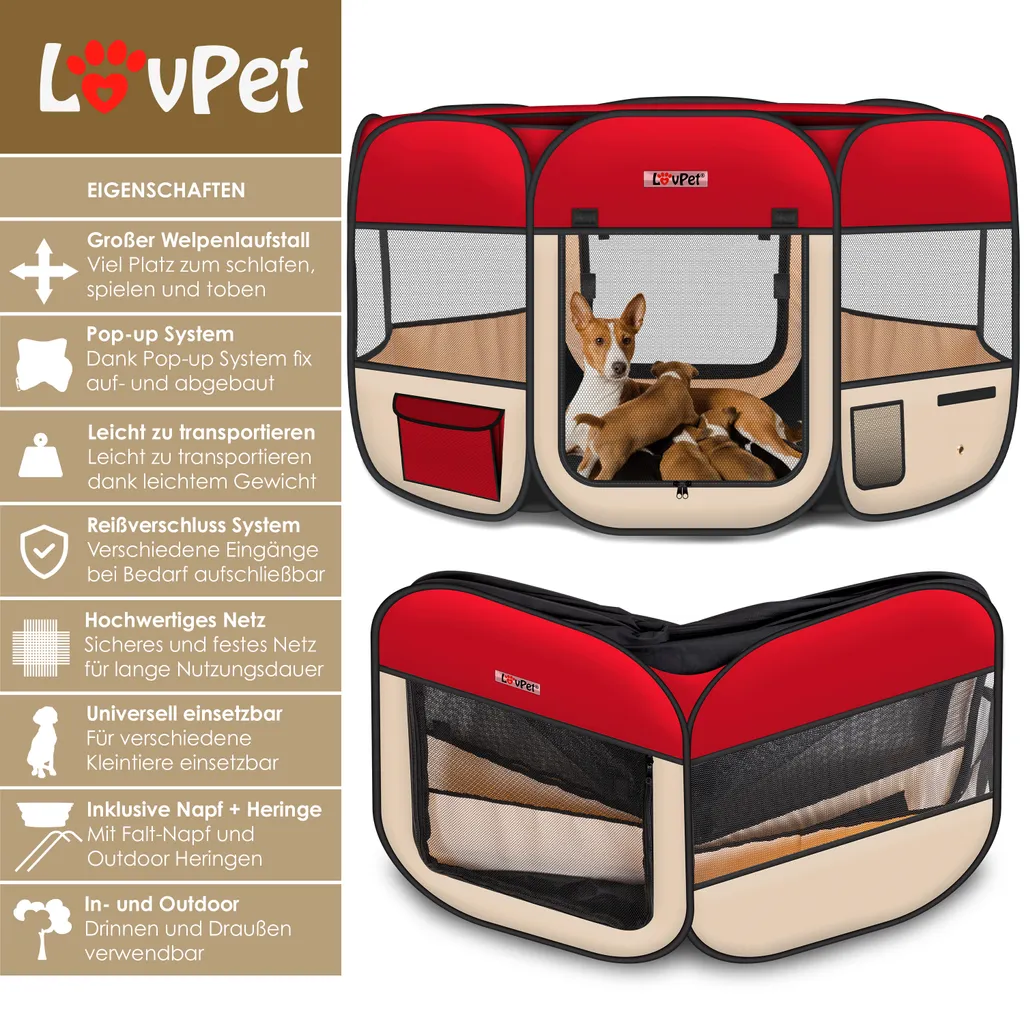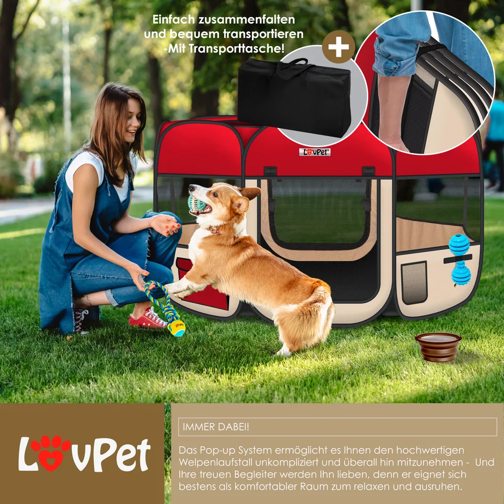 LOVPET® Welpenlaufstall Tierlaufstall Faltbar Für Kleintiere Hunde, Katzen Inkl. Hundenapf Hundelaufstall Freigehege Oxfordgewebe Pop-up System Indoor & Outdoor, Farbe:Rot / Beige
