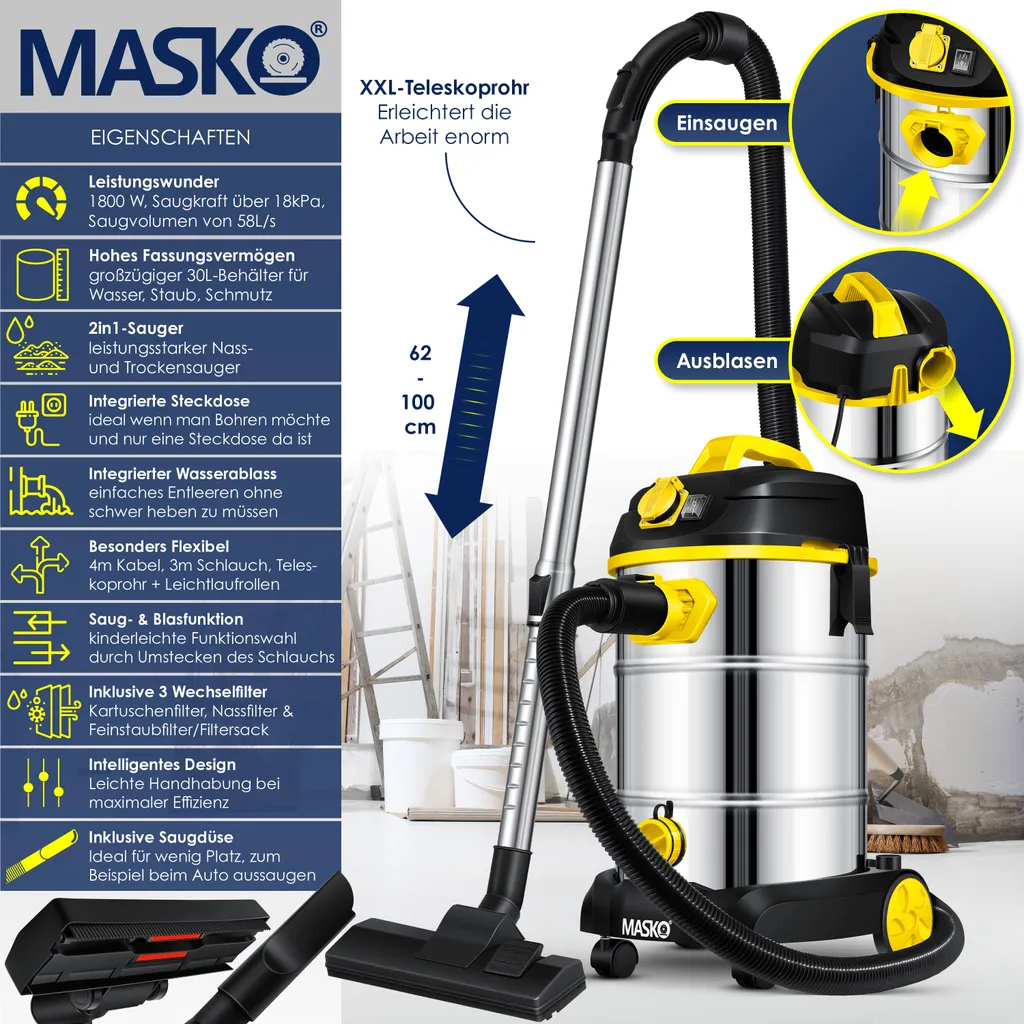 | Zusätzliche Varianten | Masko® Industriestaubsauger Staubsauger Nass Trocken Sauger Edelstahl max. 1800W, Farbe:Blau, Masko® Industriestaubsauger Staubsauger Nass Trocken Sauger Edelstahl max. 1800W, Farbe:Gelb, Masko® Industriestaubsauger Staubsauger Nass Trocken Sauger Edelstahl max. 1800W, Farbe:Rot |