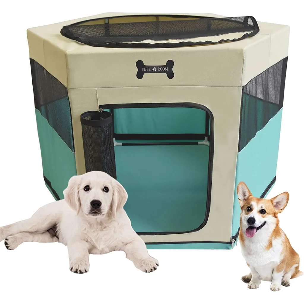 Mucola Welpenlaufstall Welpenauslauf Tierlaufstall 73x73x43 CM Türkis Beige Faltbar Freilaufgehege Hund Katze Kleintiere Hasen Haustier