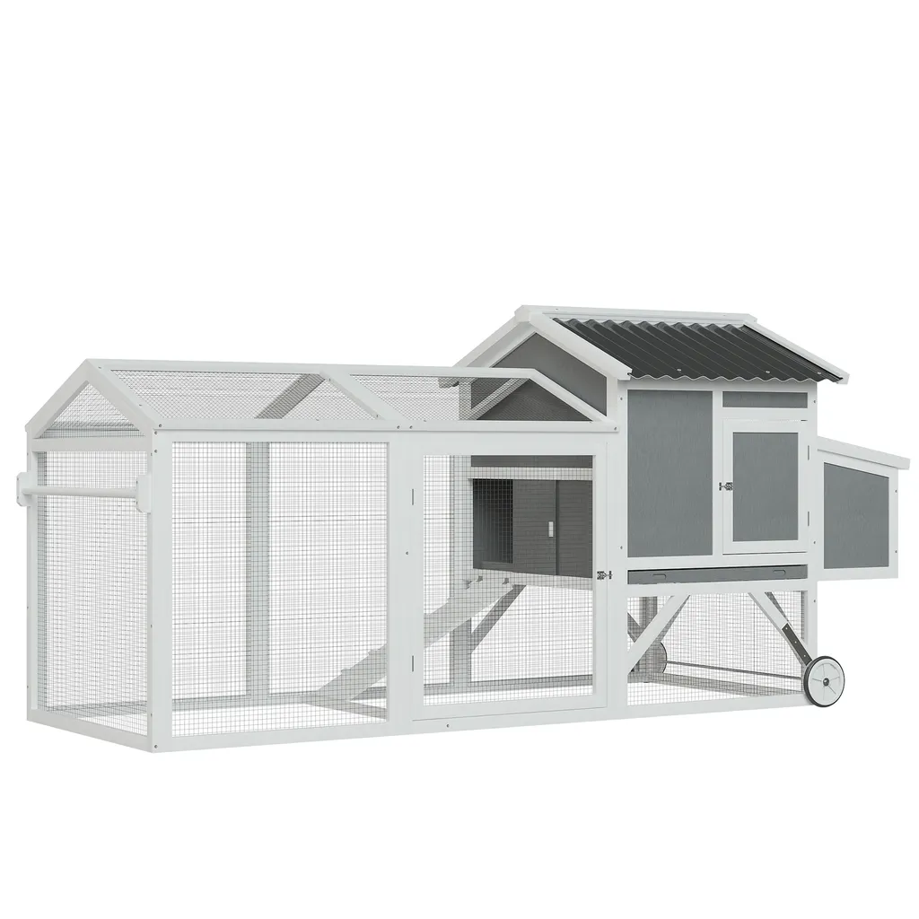 Pawhut Hühnerstall Hühnerhaus Mit Nistkasten Hühnervoliere Mit Rädern Und Griff Gehege Geflügelstall Winterfest Tannenholz PVC Grau+Weiß 247 X 90 X 114 Cm