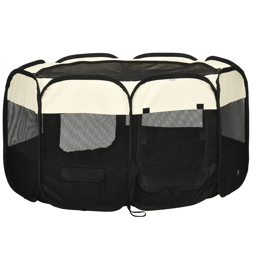 PawHut Welpenlaufstall Tierlaufstall Faltbarer Welpenauslauf Freigehege Laufstall Aus Oxfordstoff Für Kleine Hunde Und Katzen Wasserdicht Tragbar Cremeweiß+Schwarz 118 X 118 X 62 Cm