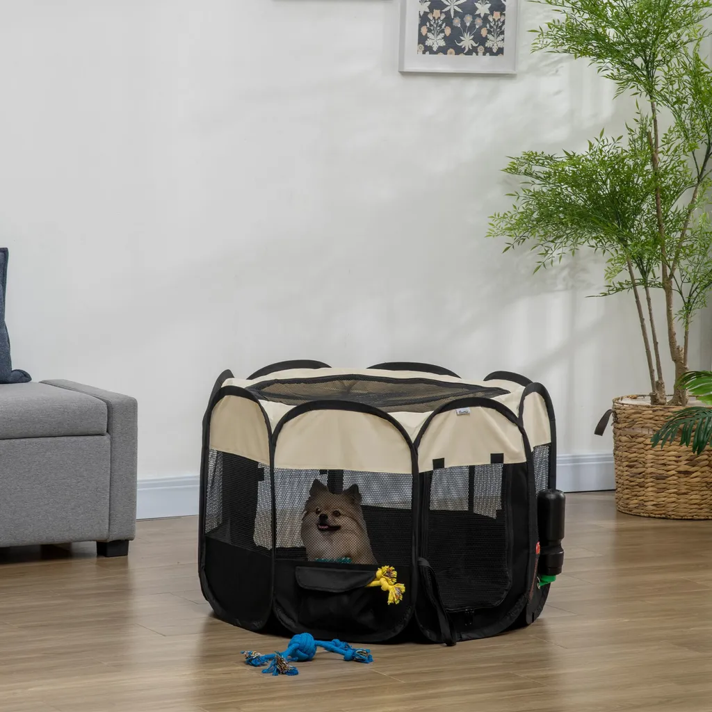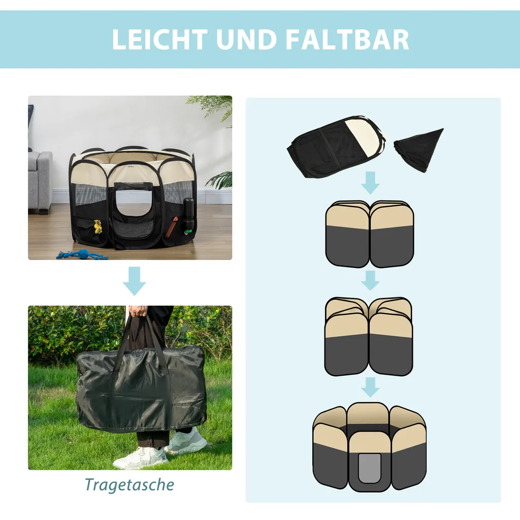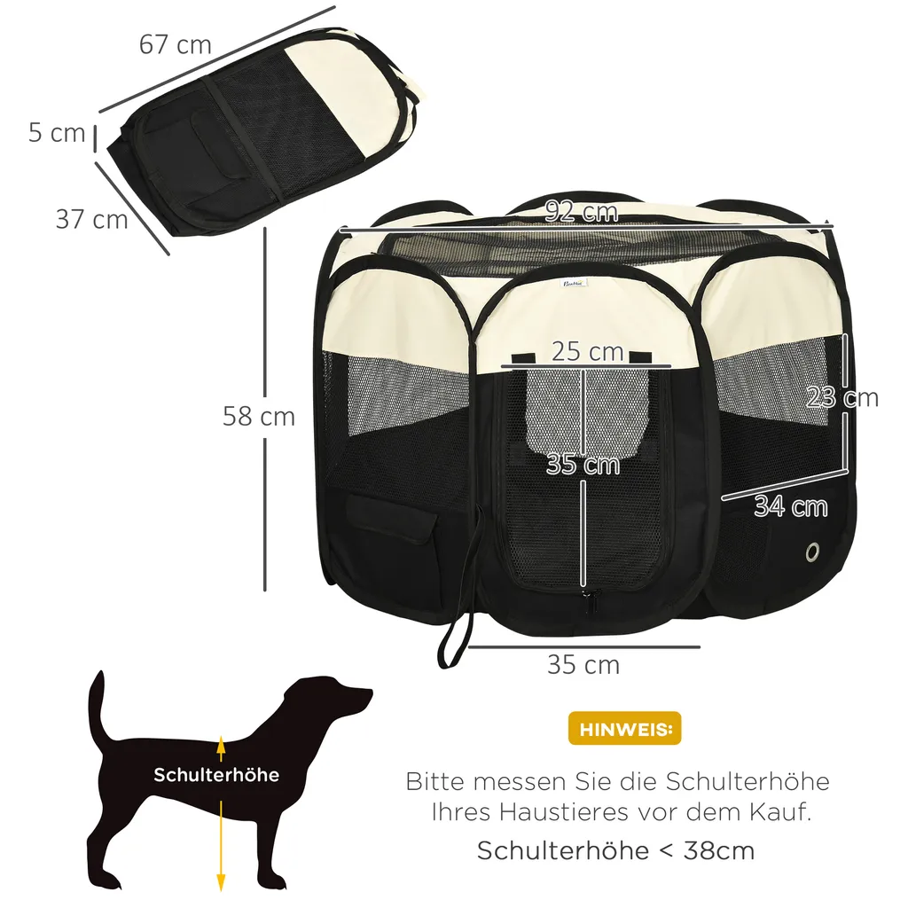 PawHut Welpenlaufstall Tierlaufstall Faltbarer Welpenauslauf Freigehege Laufstall Aus Oxfordstoff Für Kleine Hunde Und Katzen Wasserdicht Tragbar Cremeweiß+Schwarz 92 X 92 X 58 Cm