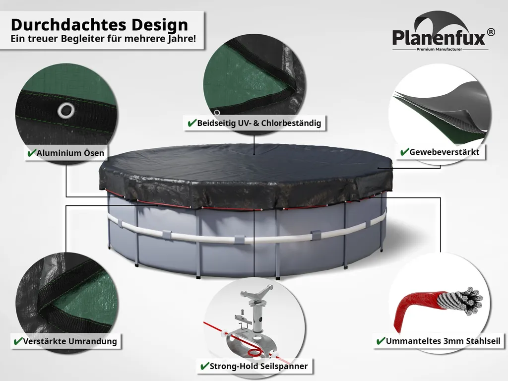 Planenfux® Pool Abdeckplane Für Ø 320 – 366 Cm Rundpools | 2-in-1 Poolabdeckung Rund Aus 200g/m² PE Material | UV-resistente Sommer- & Winterabdeckplane (Ø 420 Cm)