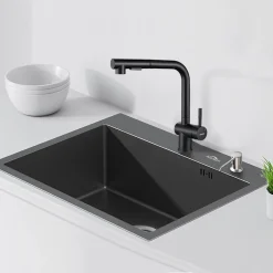 Auralum Edelstahl Küchenspüle Einbauspüle 55 × 45 CM + Hochdruck Ausziehbar Küchenarmatur, Schwarz