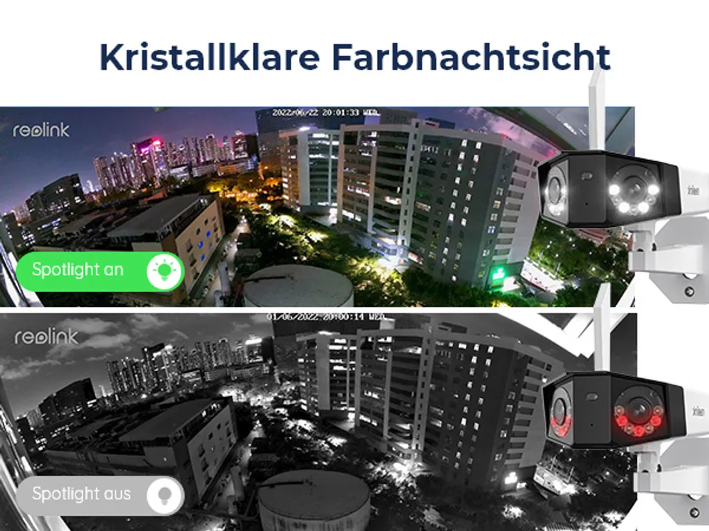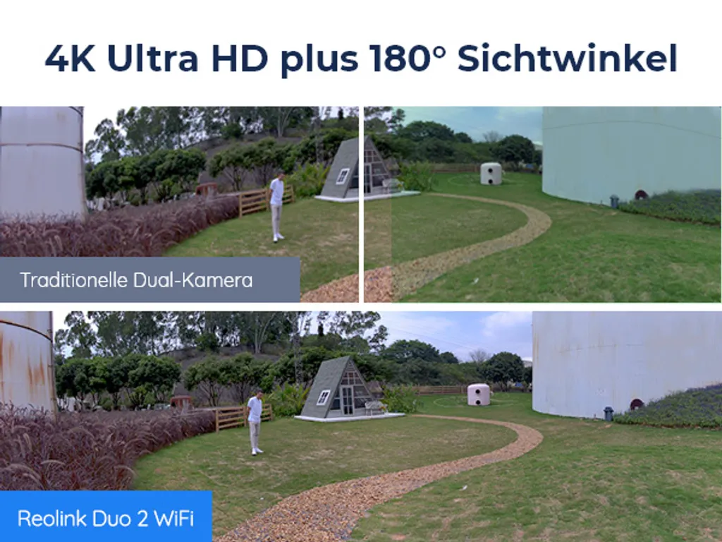 Reolink 4K Dual-Lens WLAN Überwachungskamera Aussen, 180° Ultra-Weitwinkel, Person-/Fahrzeug-/Haustier-Erkennung, 2,4/5 GHz WiFi, Farbnachtsicht, 2-Wege-Audio, Duo 2 WiFi