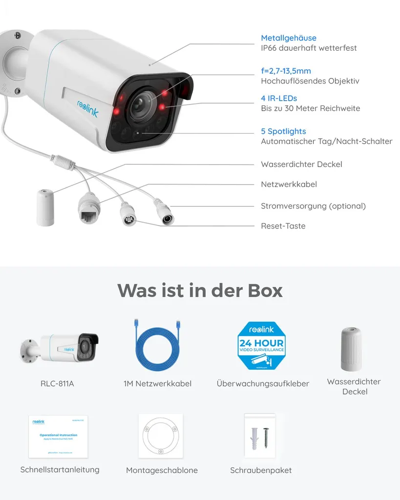 Reolink 4K Smarte PoE IP Kamera Outdoor Mit Personen-/Autoerkennung, 5X Optischer Zoom Überwachungskamera Aussen, Spotlight, Farbige Nachtsicht, Zwei-Wege-Audio, Micro SD-Kartensteckplatz, RLC-811A