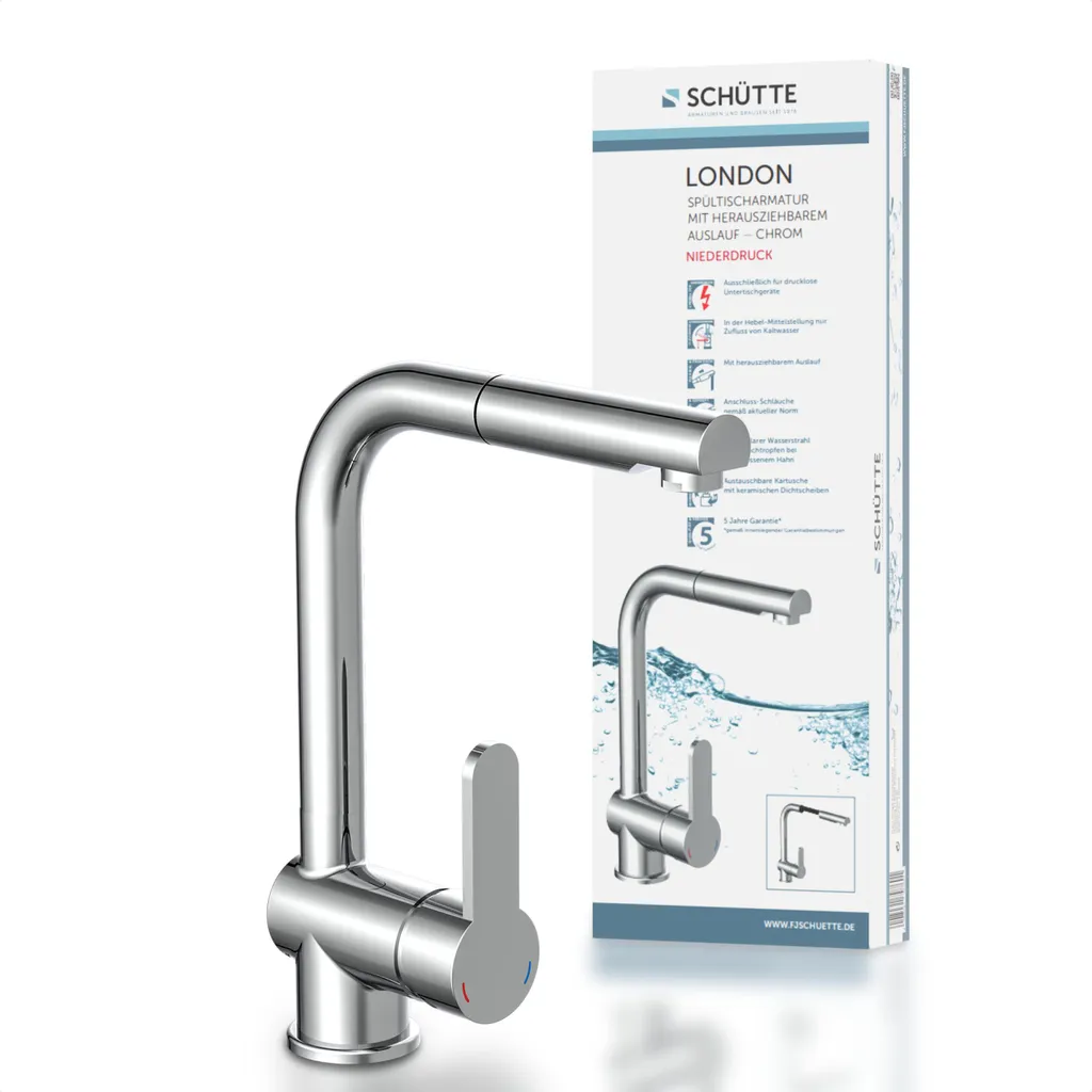 Schütte SCHÜTTE Küchenarmatur LONDON, Niederdruck Armatur Küche, Wasserhahn Küche Ausziehbar, Mischbatterie Küche Chrom