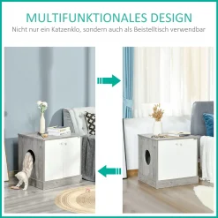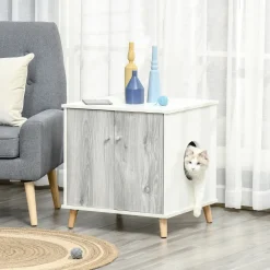 Pawhut Katzenschrank Für Katzentoilette Katzenklo Beistelltisch Katzenhaus Mit Türöffnung Nachttisch PB-Platte Graue Eiche+Weiß 60 X 55 X 62,5 Cm