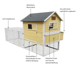 Dehner Hühnerstall Happy Farm Miami, Mit Freigehege, 158.5 X 337 X 145.8 Cm, Holz/Filz, Gelb/weiß