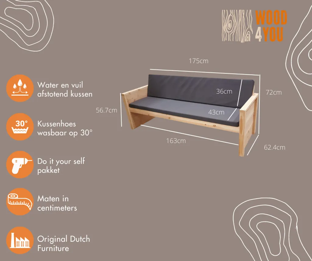 Wood4you – Gartenbank Vlieland – ‚Do It Yourself‘ Bausatz Douglasienholz 175Lx72Hx57T Cm – Inkl. Kissen